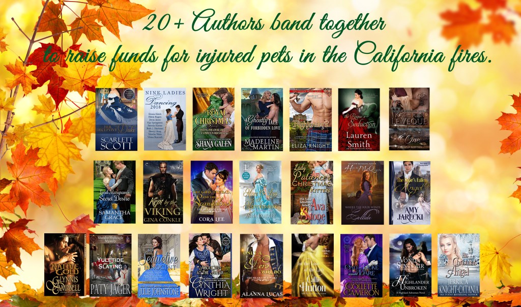Twenty+ authors have banded together to raise funds for pets injured in the California fires. On Thanksgiving Day, purchase one (two, three or all!) of the listed books, and the authors’ royalties will be donated to a cause helping fur babies.